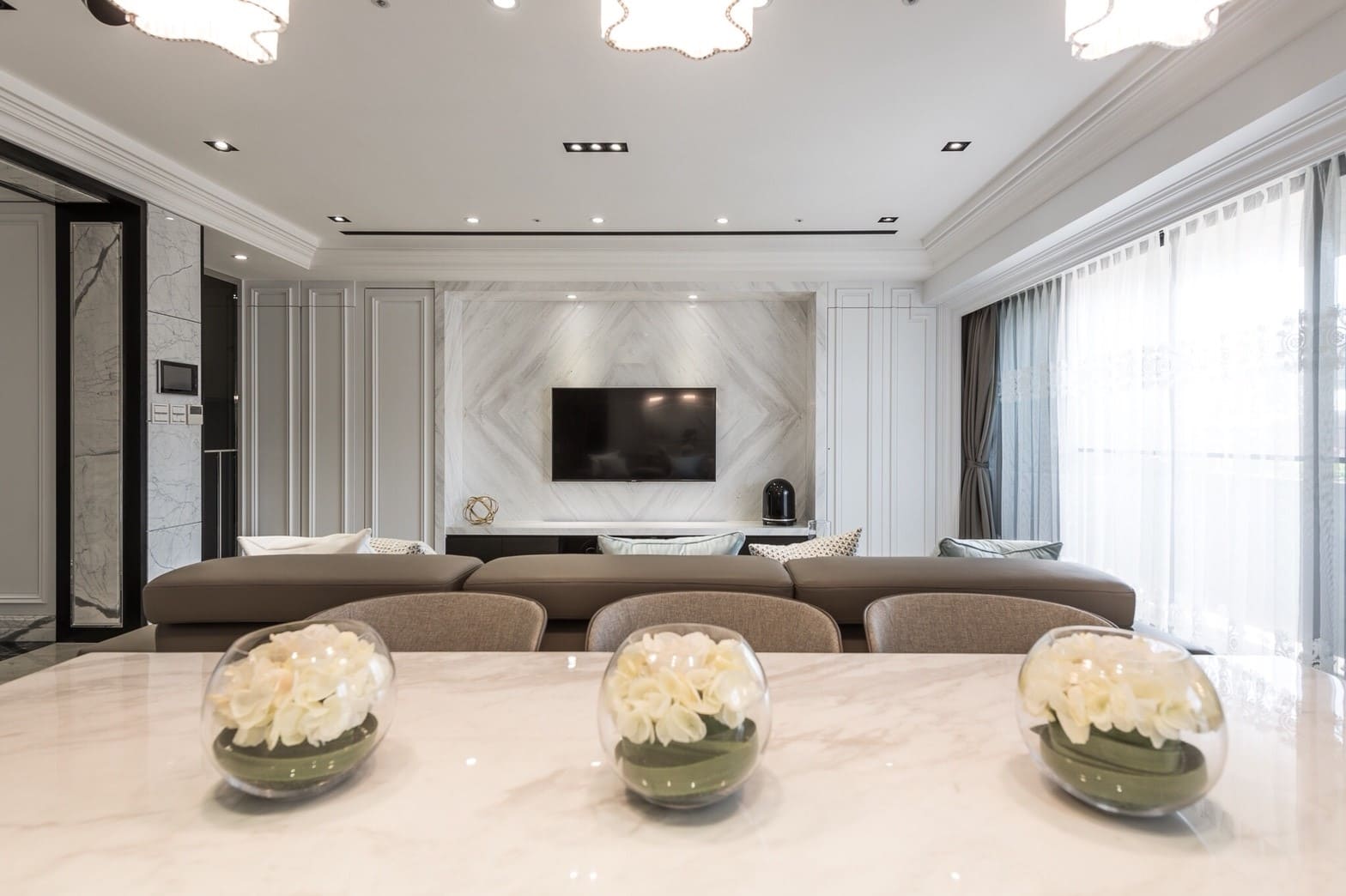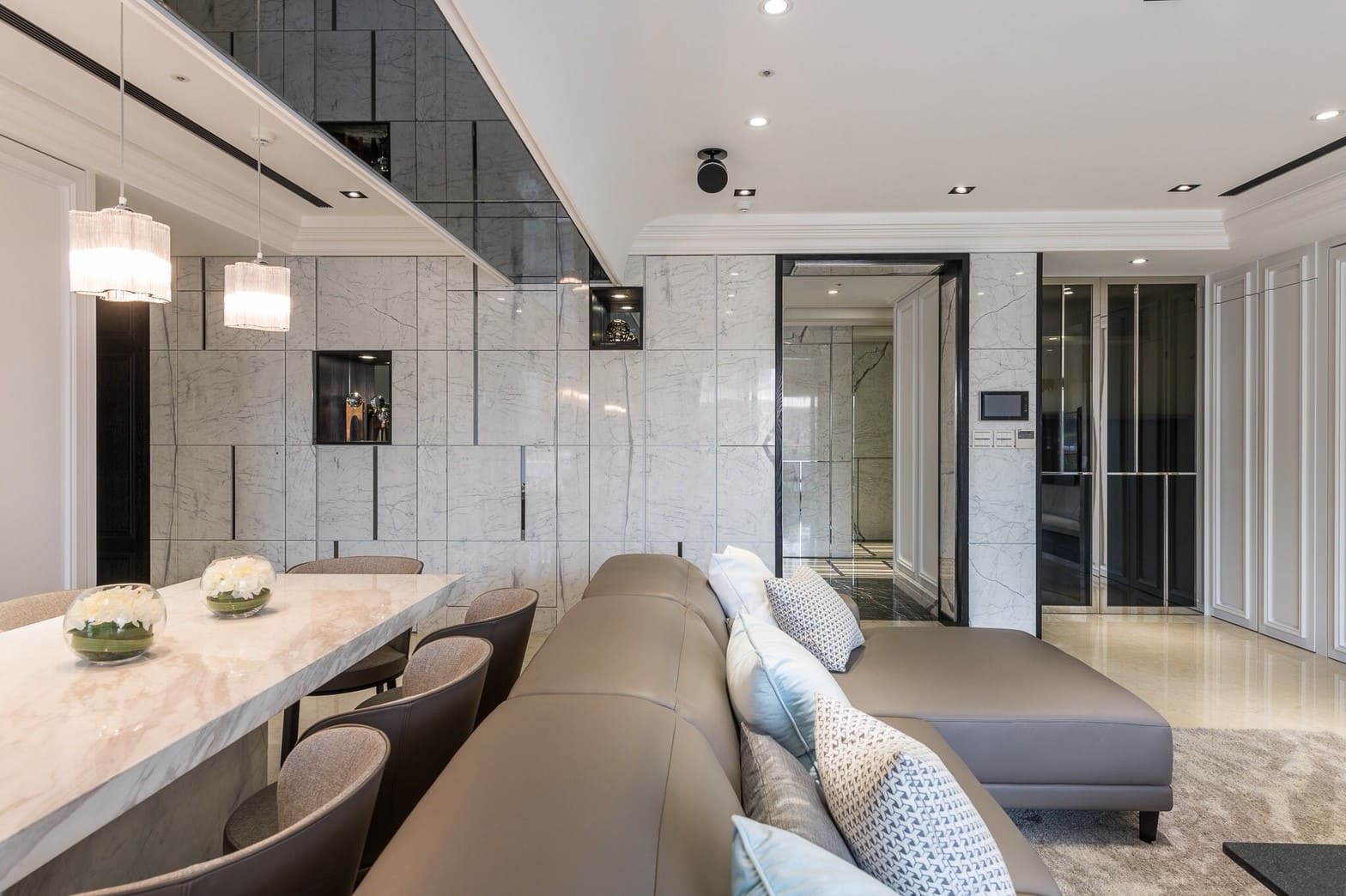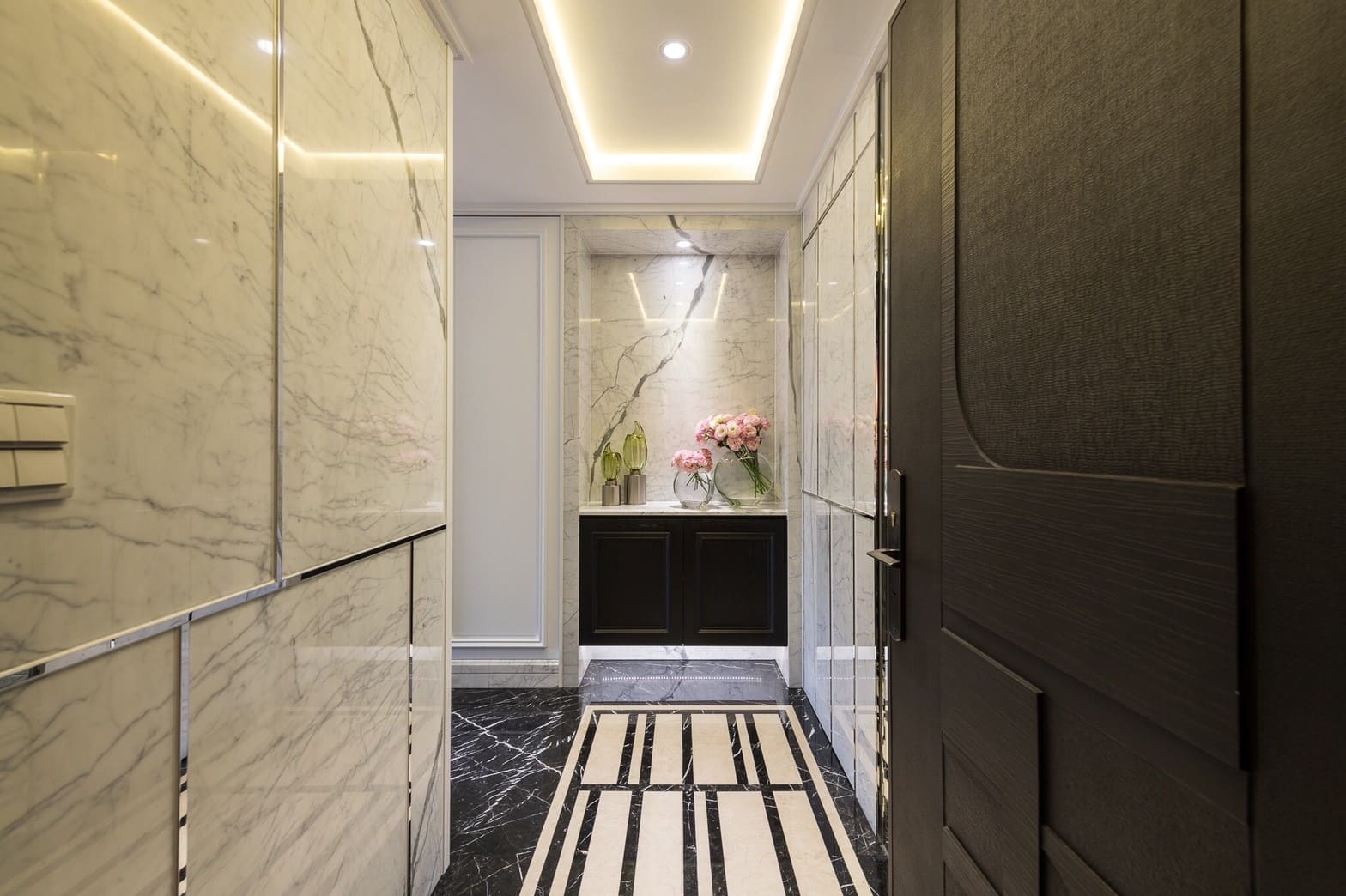 本案以典雅大理石搭配輕盈的白色調傢俱構築出現代新古典風格美宅。設計師巧妙運用米黃石材拼貼於黑色大理石中,增添玄關廊道的層次。客廳電視牆則使用對花設計,呈現大理石向外擴散的菱形狀,簡單定調客廳視覺中心。此外,從公共空間至私人場域,設計師也採用垂直收納設計,讓住戶既可系統地收納物品同時讓牆面線條乾淨俐落。讓生活的細緻與美好從家出發!