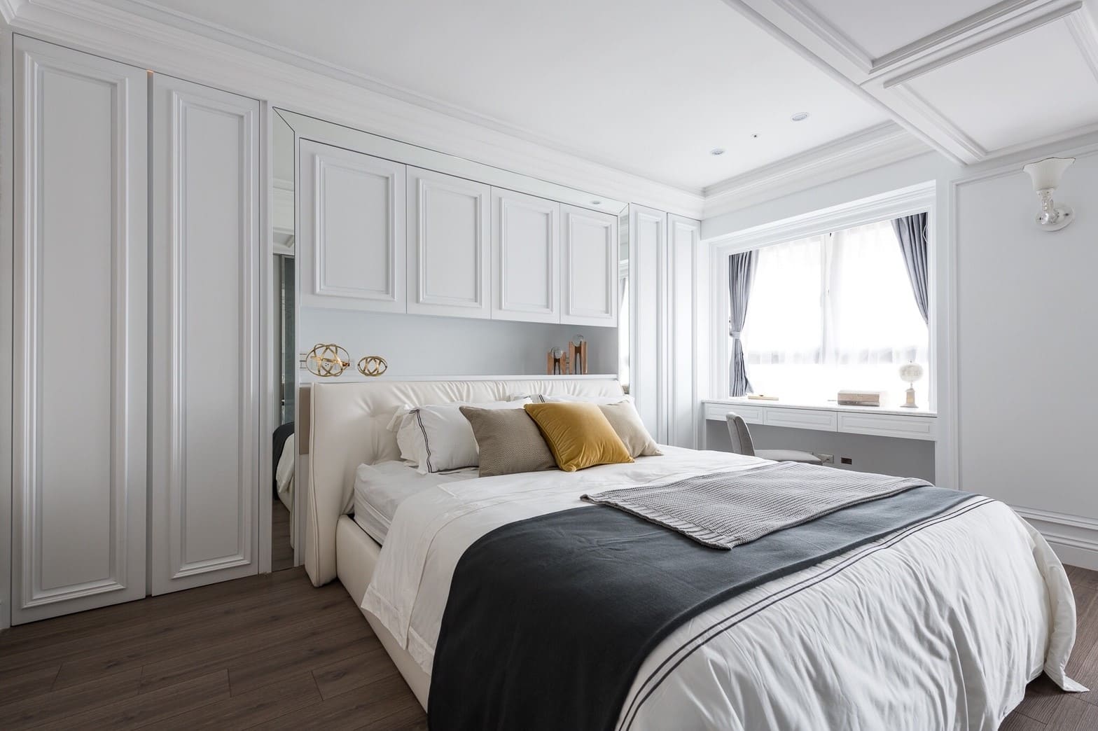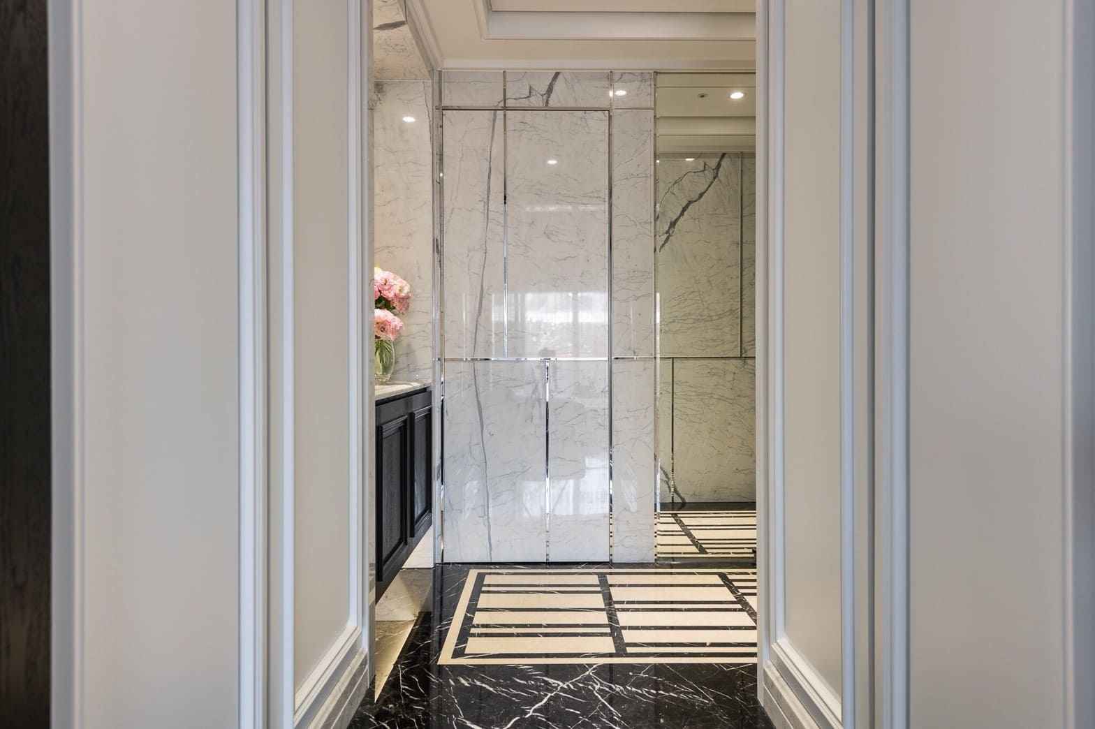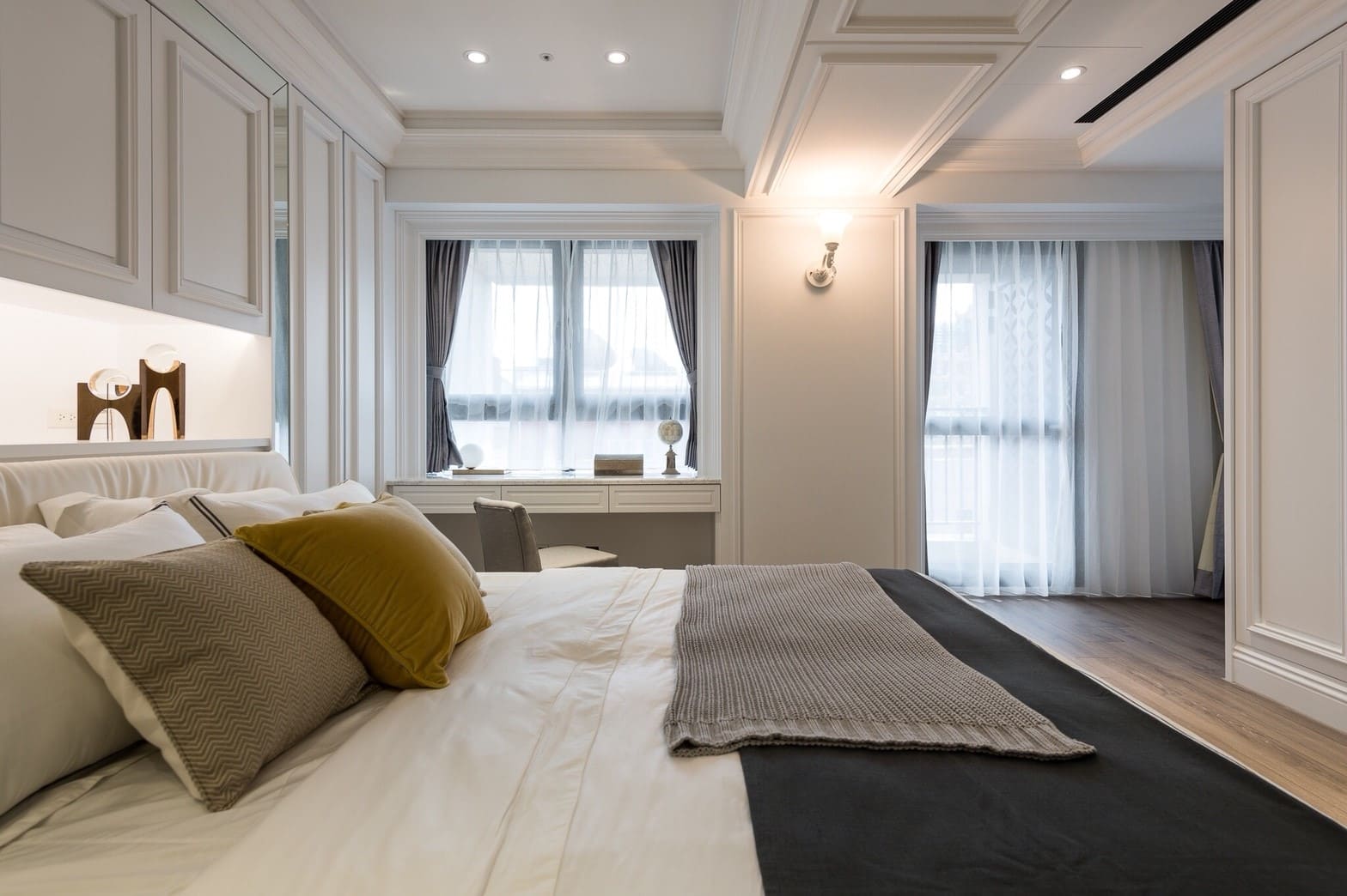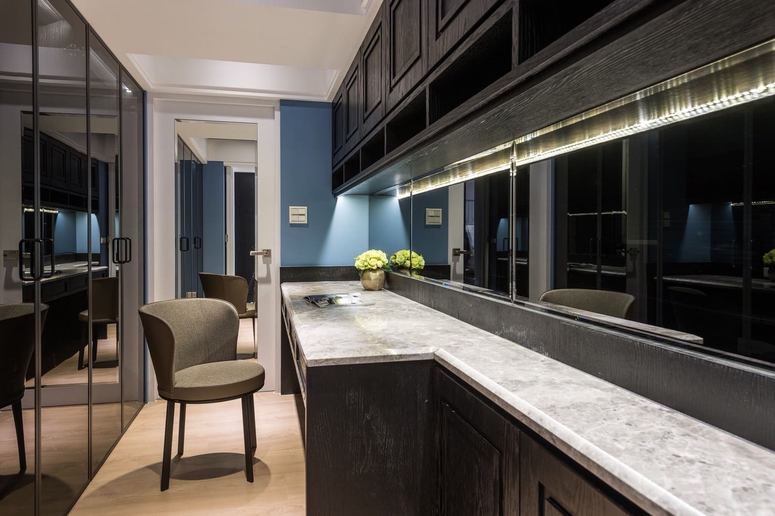 本案以典雅大理石搭配輕盈的白色調傢俱構築出現代新古典風格美宅。設計師巧妙運用米黃石材拼貼於黑色大理石中,增添玄關廊道的層次。客廳電視牆則使用對花設計,呈現大理石向外擴散的菱形狀,簡單定調客廳視覺中心。此外,從公共空間至私人場域,設計師也採用垂直收納設計,讓住戶既可系統地收納物品同時讓牆面線條乾淨俐落。讓生活的細緻與美好從家出發!