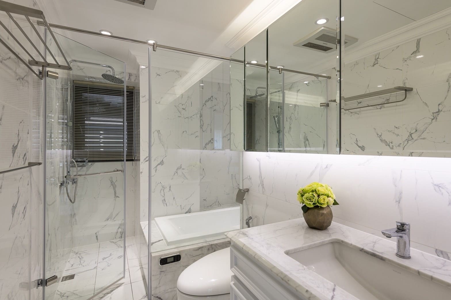 In this residence project, the designer uses elegant marble with light white furniture to build a modern style house. Beige stone and black marble are collaged to add the level of the corridor. The TV wall is applied with book matched marble stone, presenting a diamond shape spreading outward, simply setting the visual center of the living room. In addition, from public spaces to private areas, the designer also adopts a vertical storage design, allowing residents to systematically store items while keeping the walls clean and tidy.