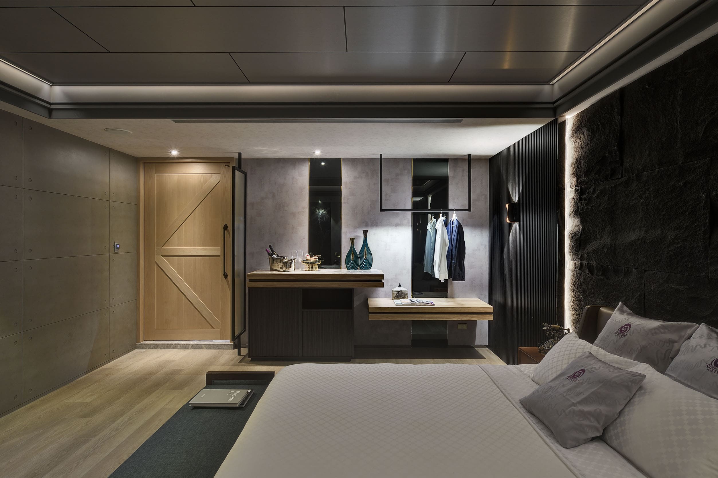 This is a motel interior design case. To create a simple atmosphere, the suite is designed with sharp, clean lines and combined with a natural stone wall. In terms of lighting, the designer uses downlights and bracket lights in areas outside the beds, and indirect lighting above the beds to reduce light interference. They are arranged to ensure adequate indoor lighting and the quality of rest for guests.