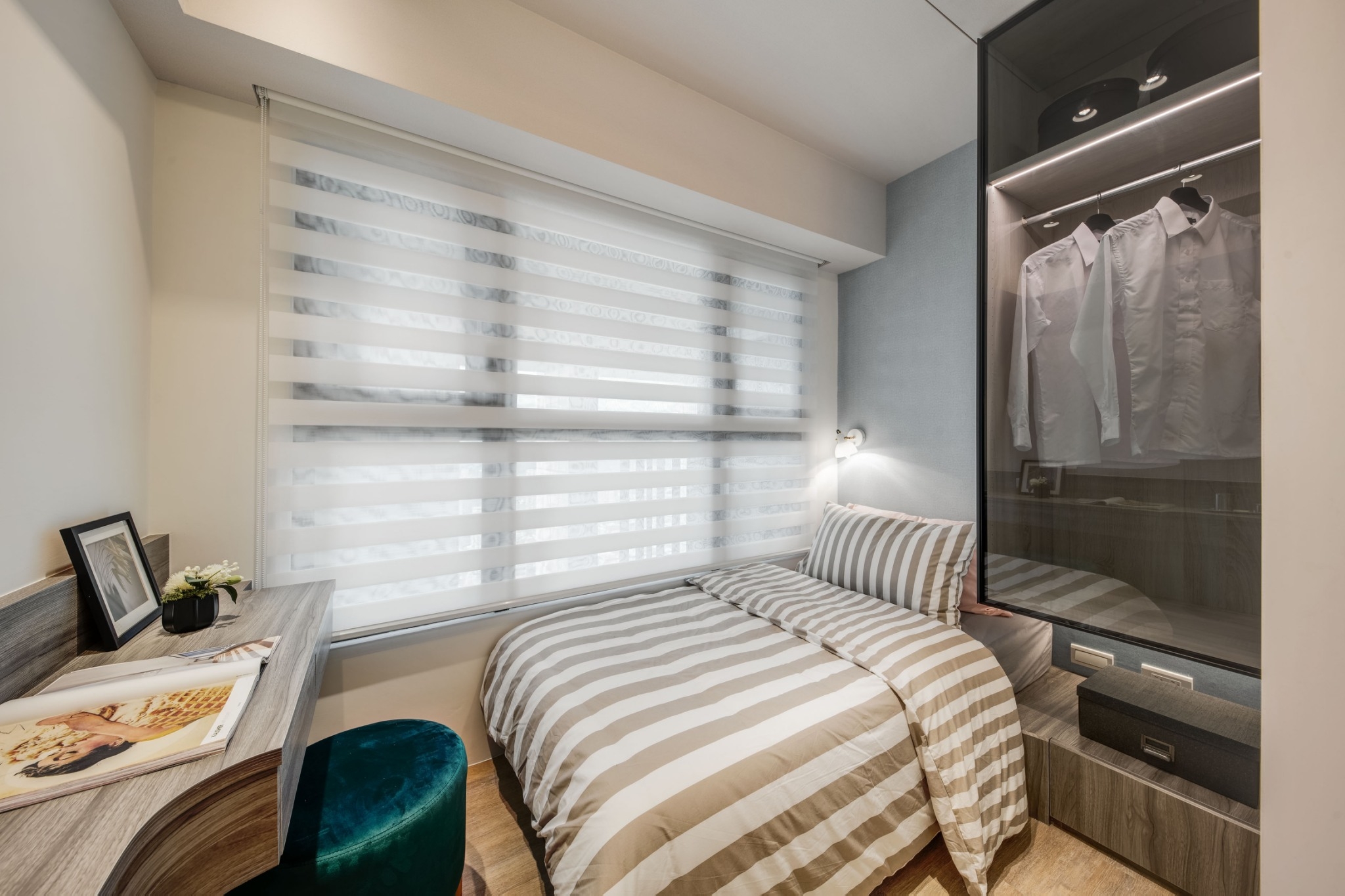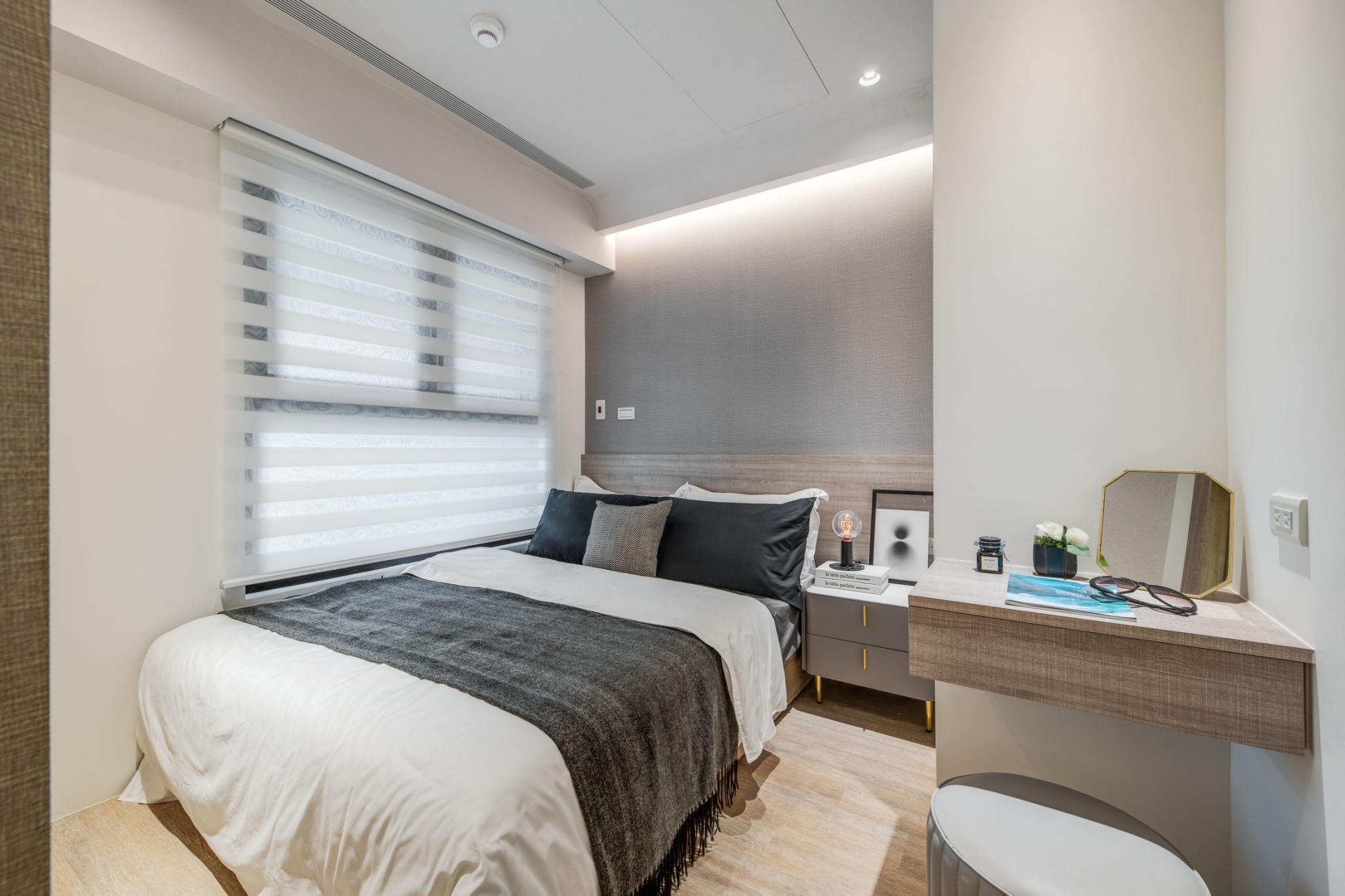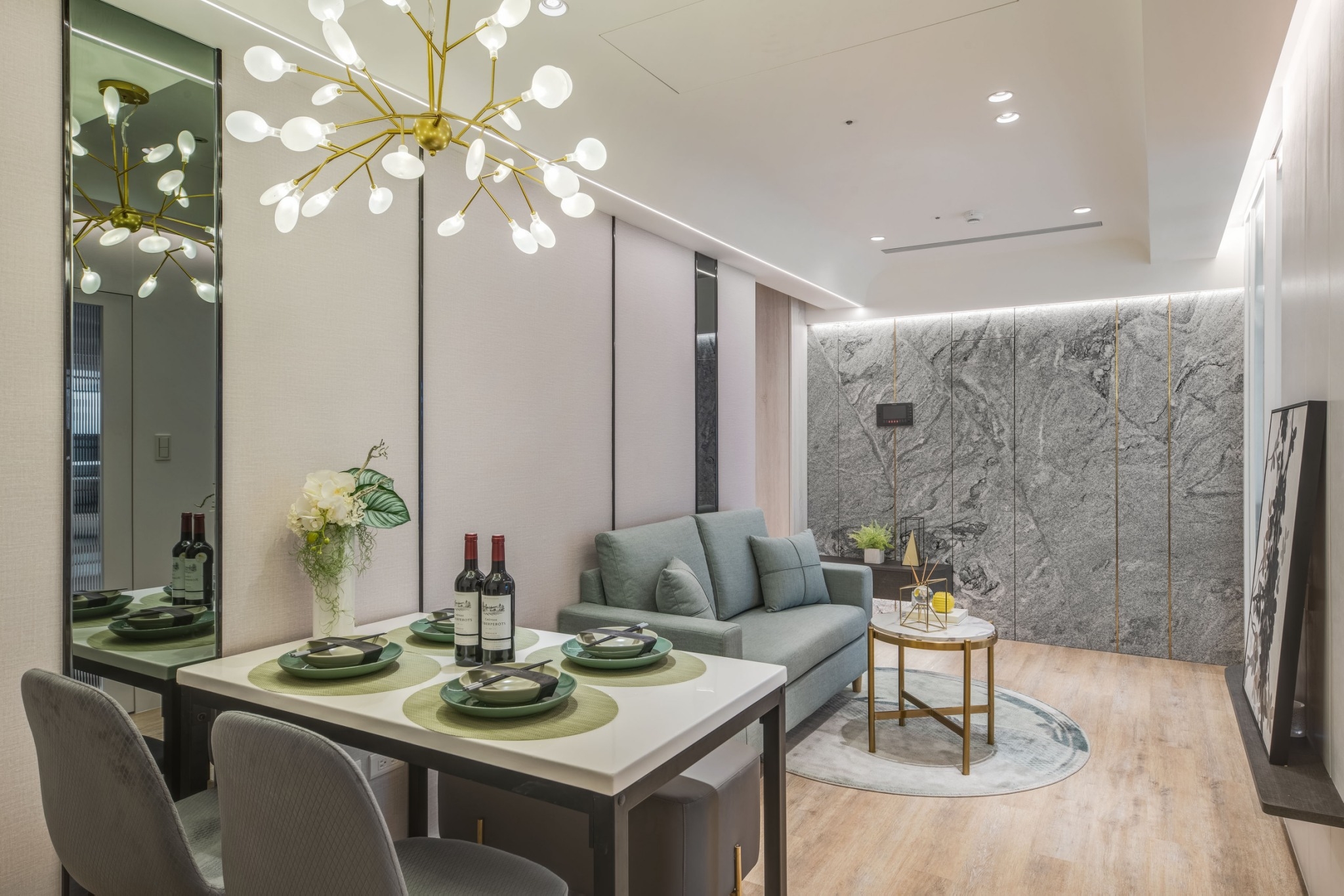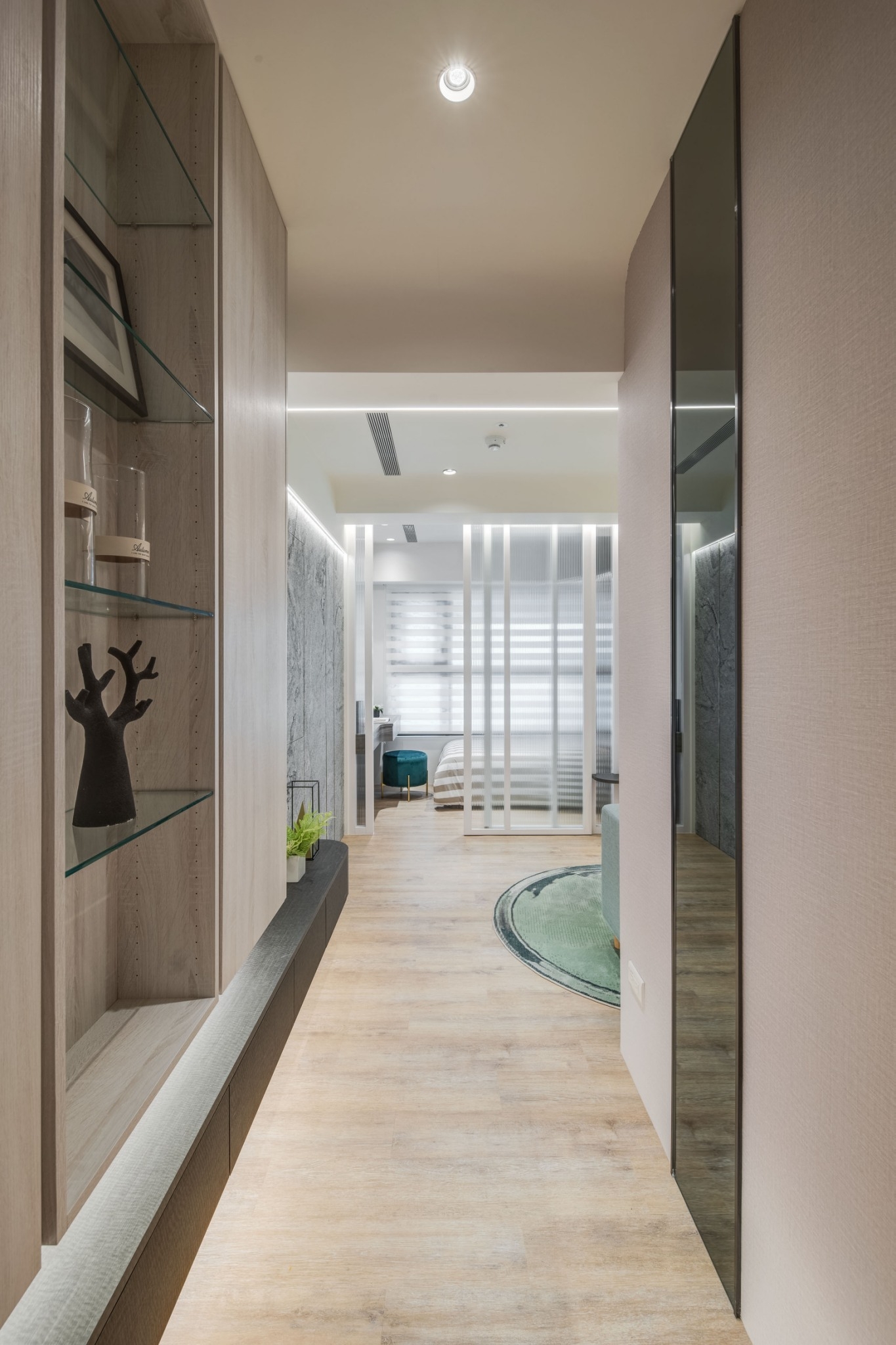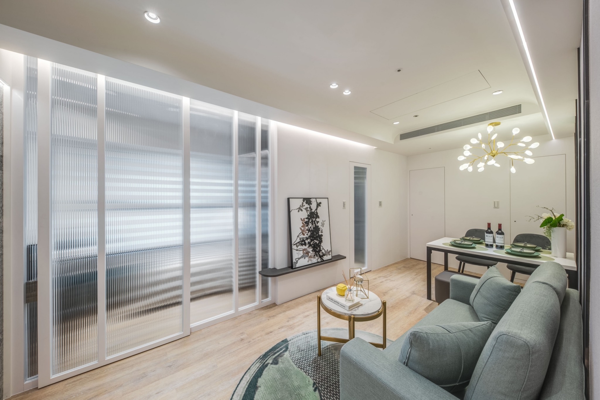 明亮、現代風格的居家空間,利用大面積的淺色材質,以及具穿透感的玻璃隔間,將室外陽光引進客廳,打造明亮且舒適的氛圍。