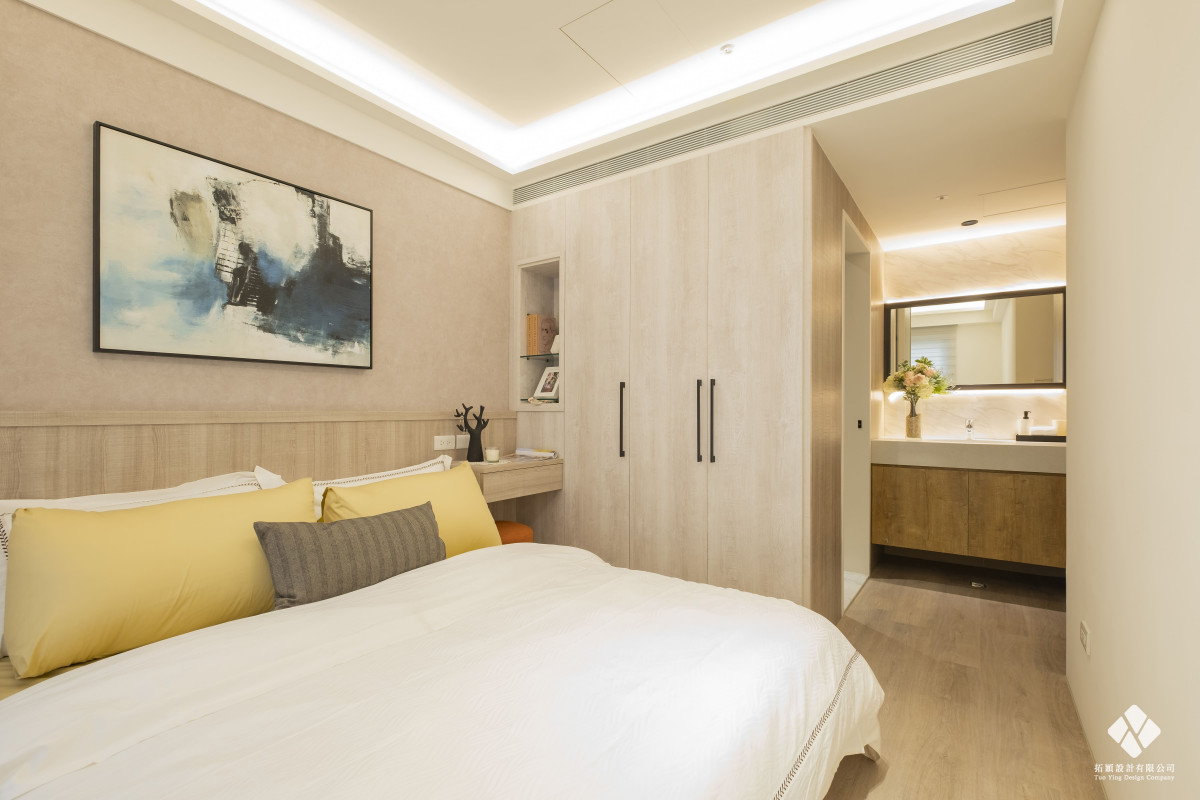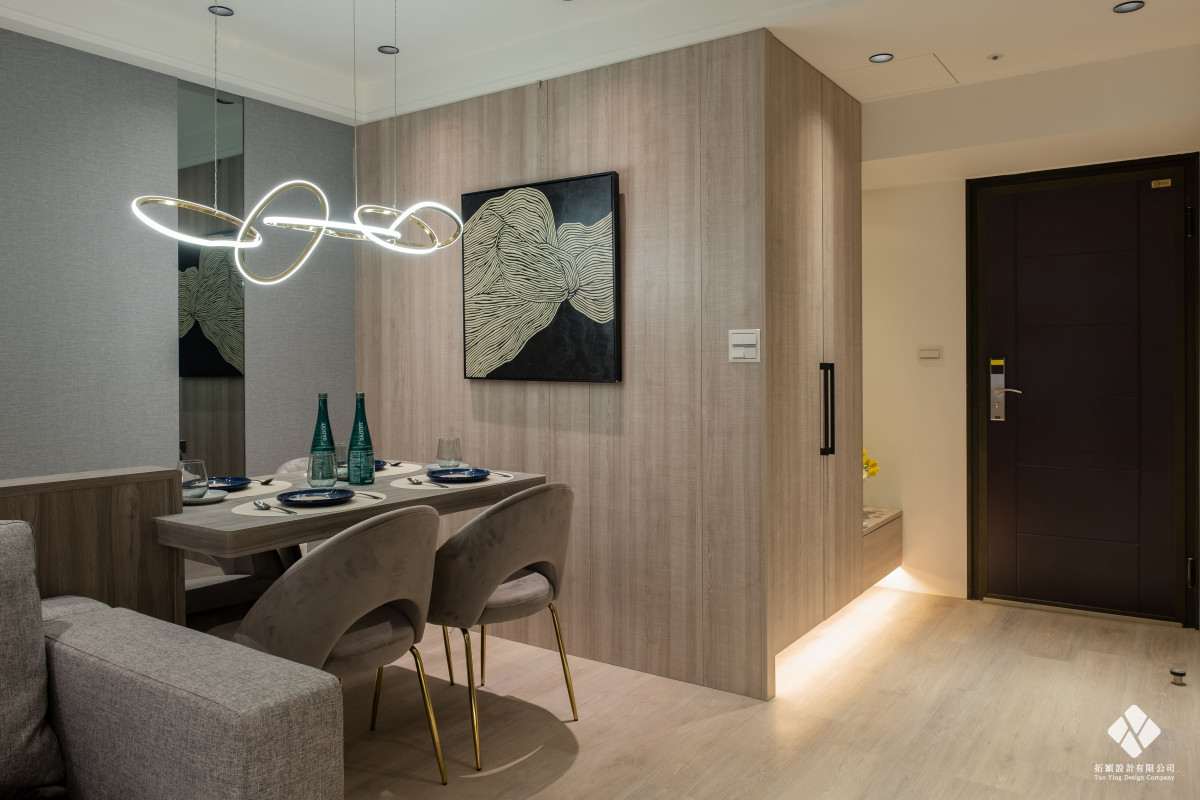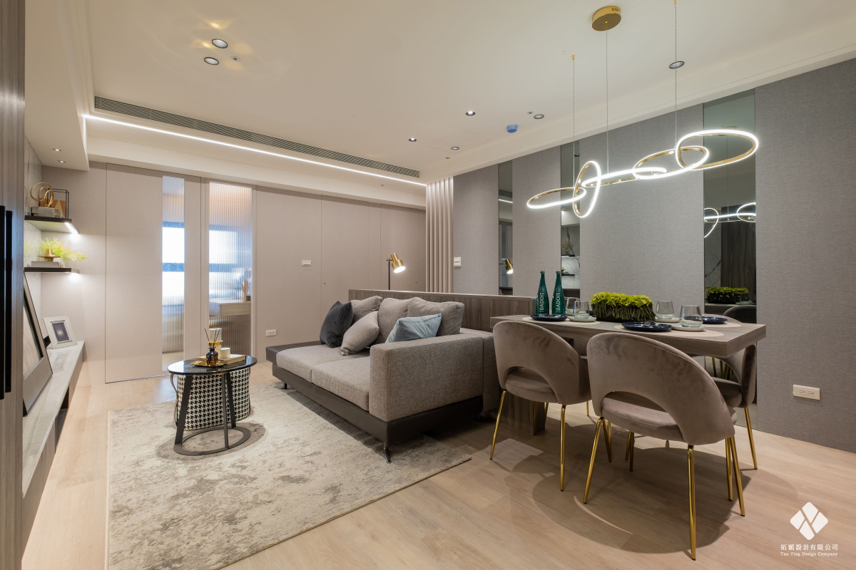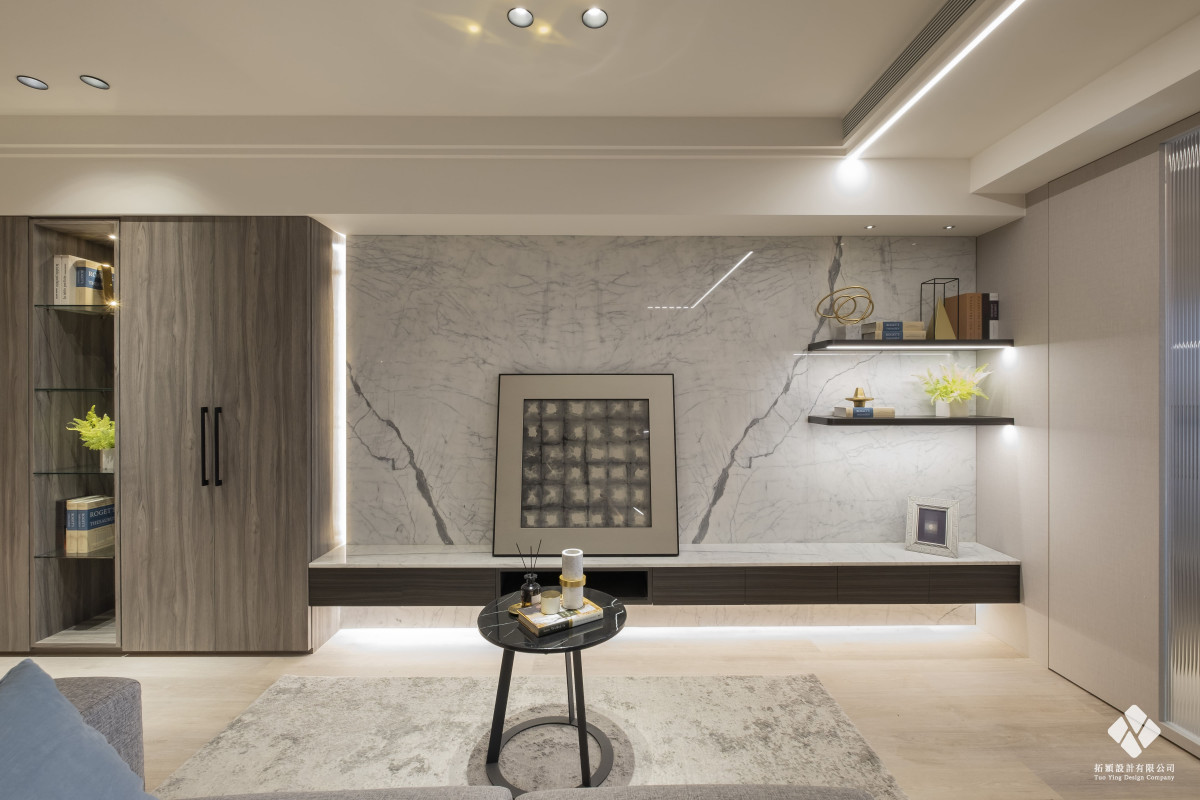 設計師以極簡風鋪陳一家四口的居所,精心規劃行、住、坐、臥皆有連結的場域,給予家人擁有各自獨立同時能感受彼此互動的空間。電視牆採用紋路細膩、剔透的「義大利雕刻白」大理石,原色石材牆面既彰顯了家的質感,更成空間中的一道美景。沙發背牆、書桌與餐桌合為一體的設計,兼具多功能與放大空間的效果。門體凹空的設計也將光線引入生活場所,讓光線所到之處有溫度也有溫情。
