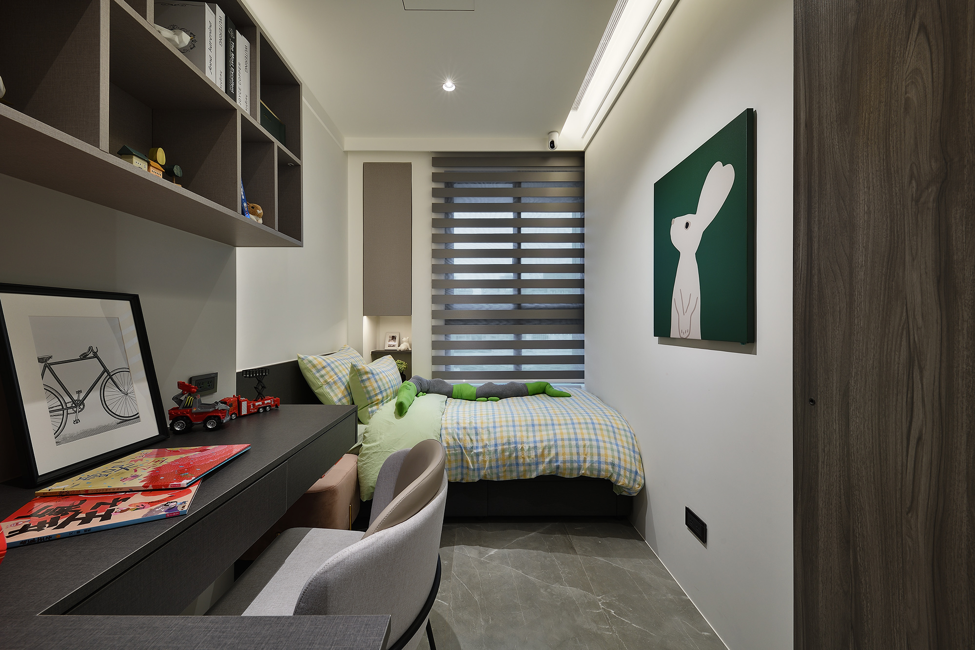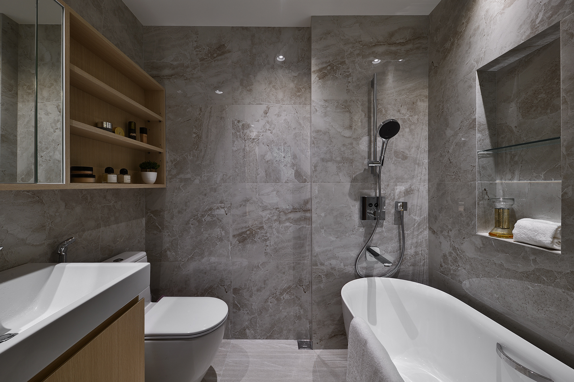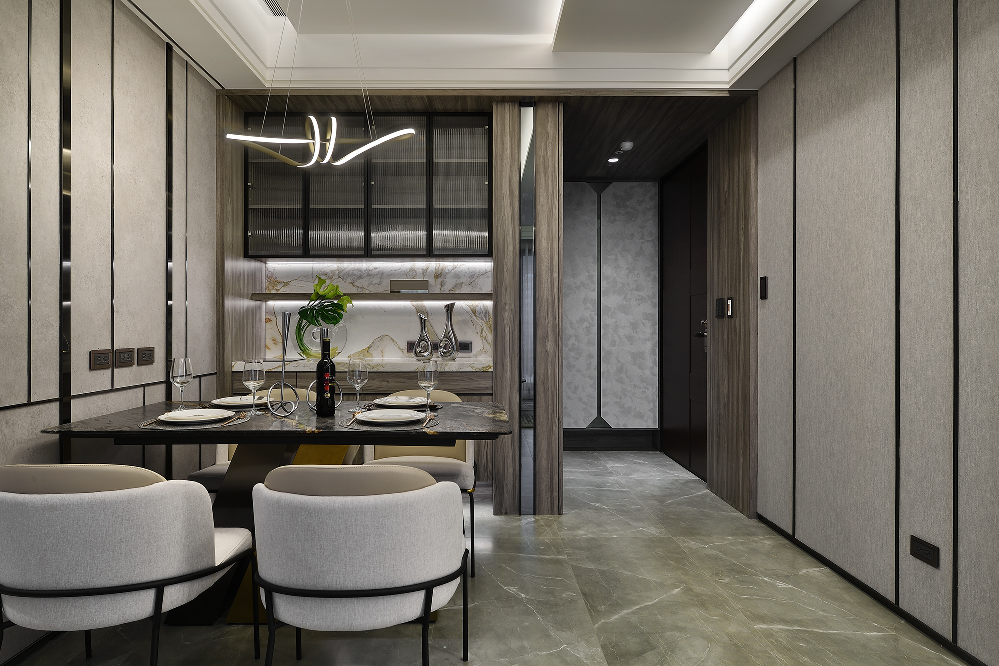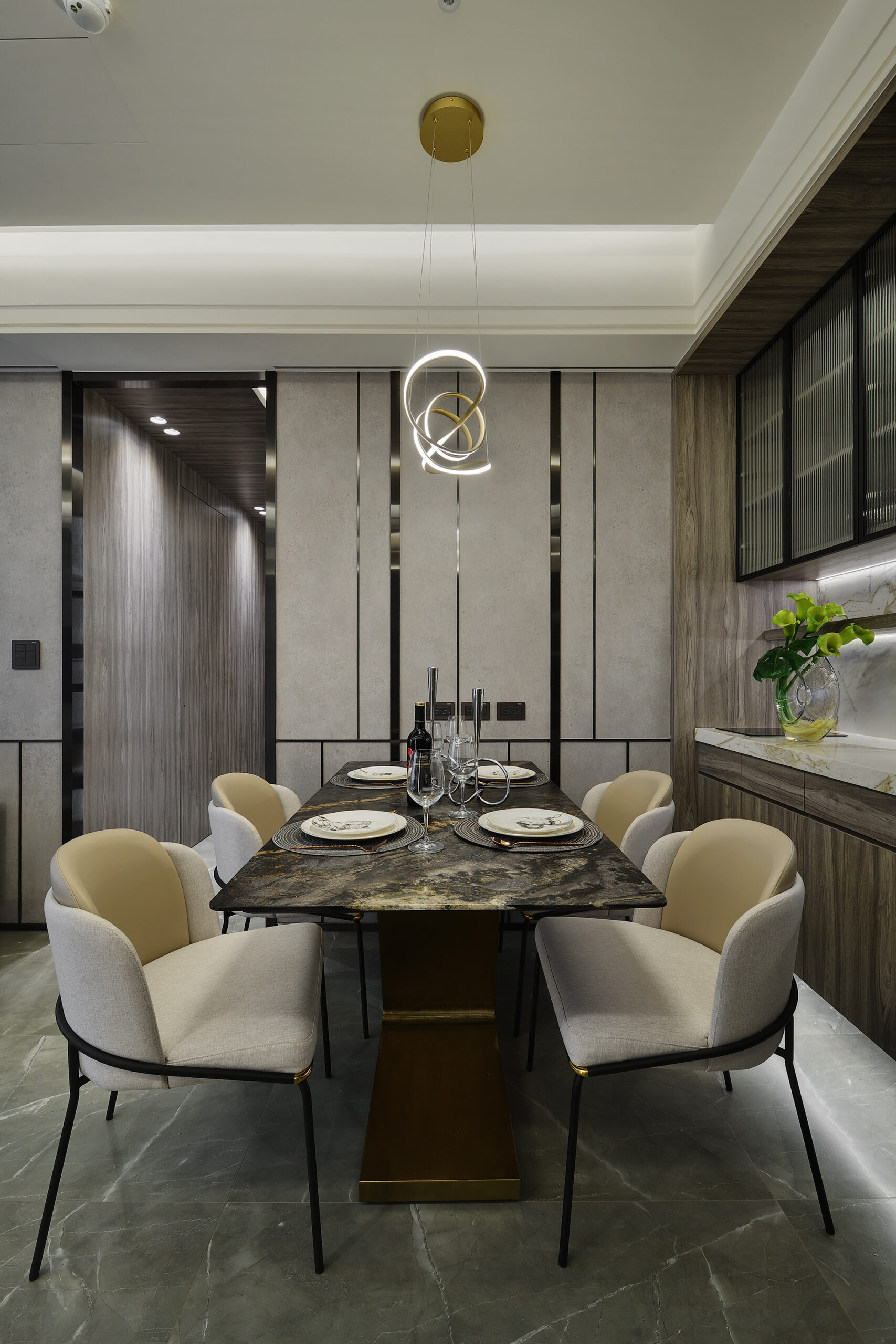 我們利用不同材質的搭配及特殊造型設計,將不同的設計手法隱藏在空間中。藉由特殊的大理石及金屬的結合,打造出獨一無二的飯店宅。深色的木皮使空間多了溫潤、沉穩的感受,走道的特殊漆牆面搭配大理石端景牆豐富了空間,也使家的每一個角落都具有輕奢的美感。低調而奢華的態度,從空間中的細節就能細細品味!