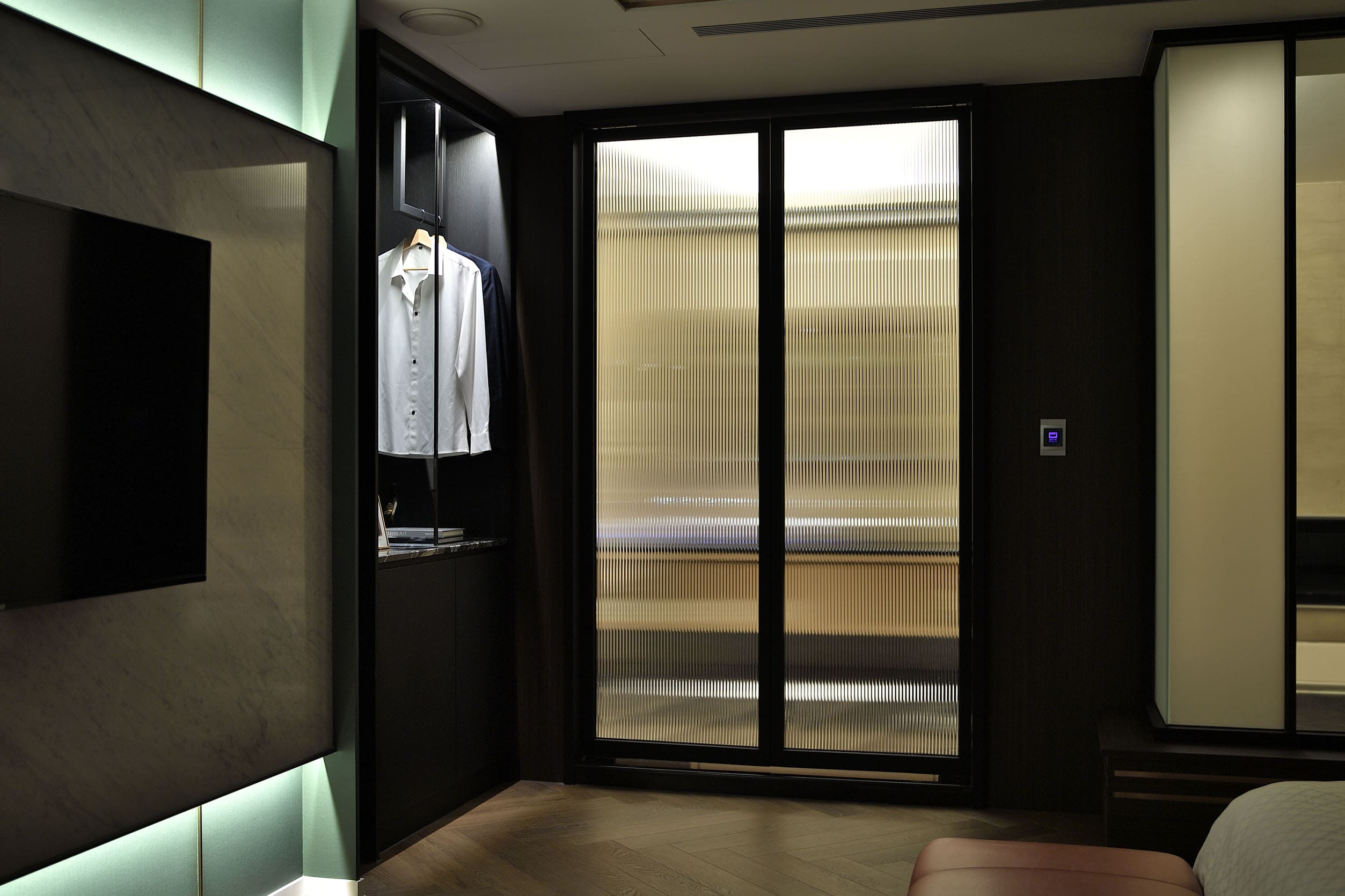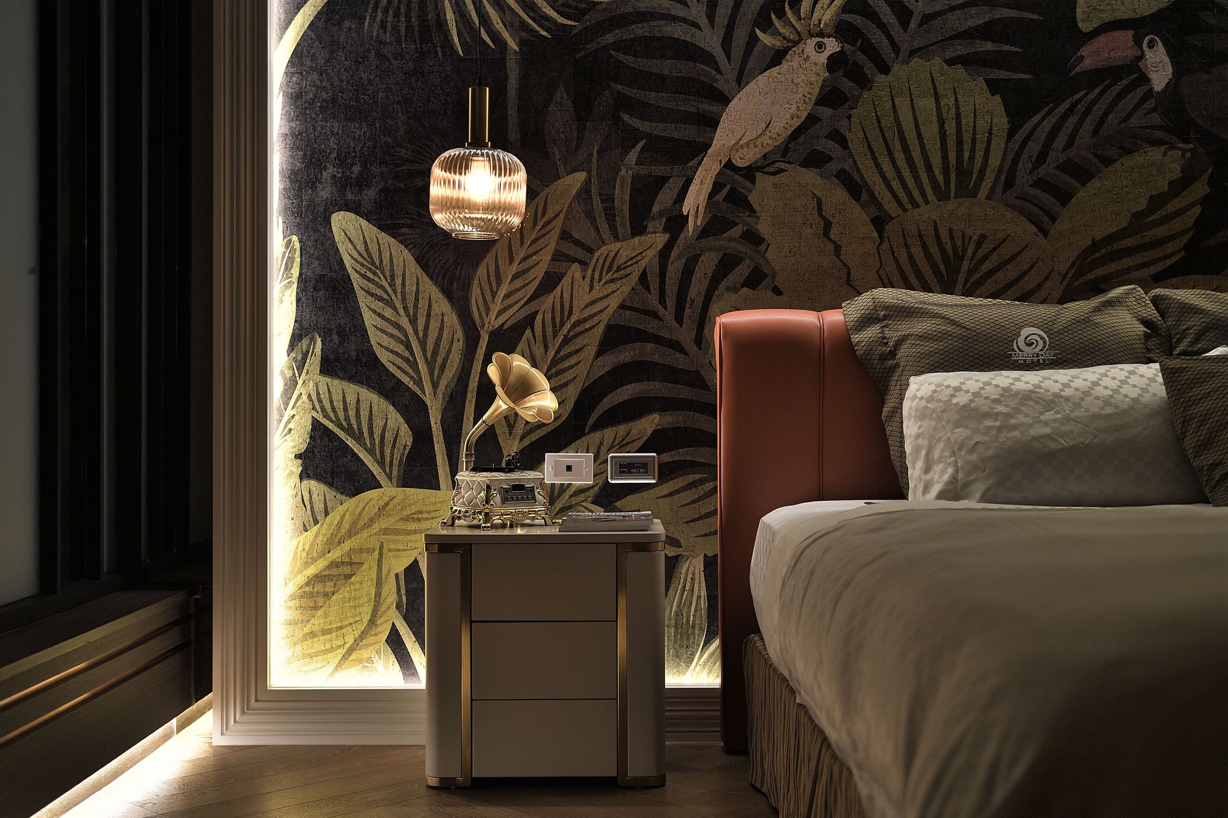 This is a motel interior design case. The interior design of the suite follows a modern line, but full of tropical botanical elements. The pattern of wallpaper is full of various tropical plants and animals, combined with light brown wooden floors, as if welcoming nature into the room. Moreover, orange bedding sets adds to a sense of vibrancy into the space. Partition walls are made from Translucent and textured glass that allow for the benefits of natural light while helping to maintain privacy.