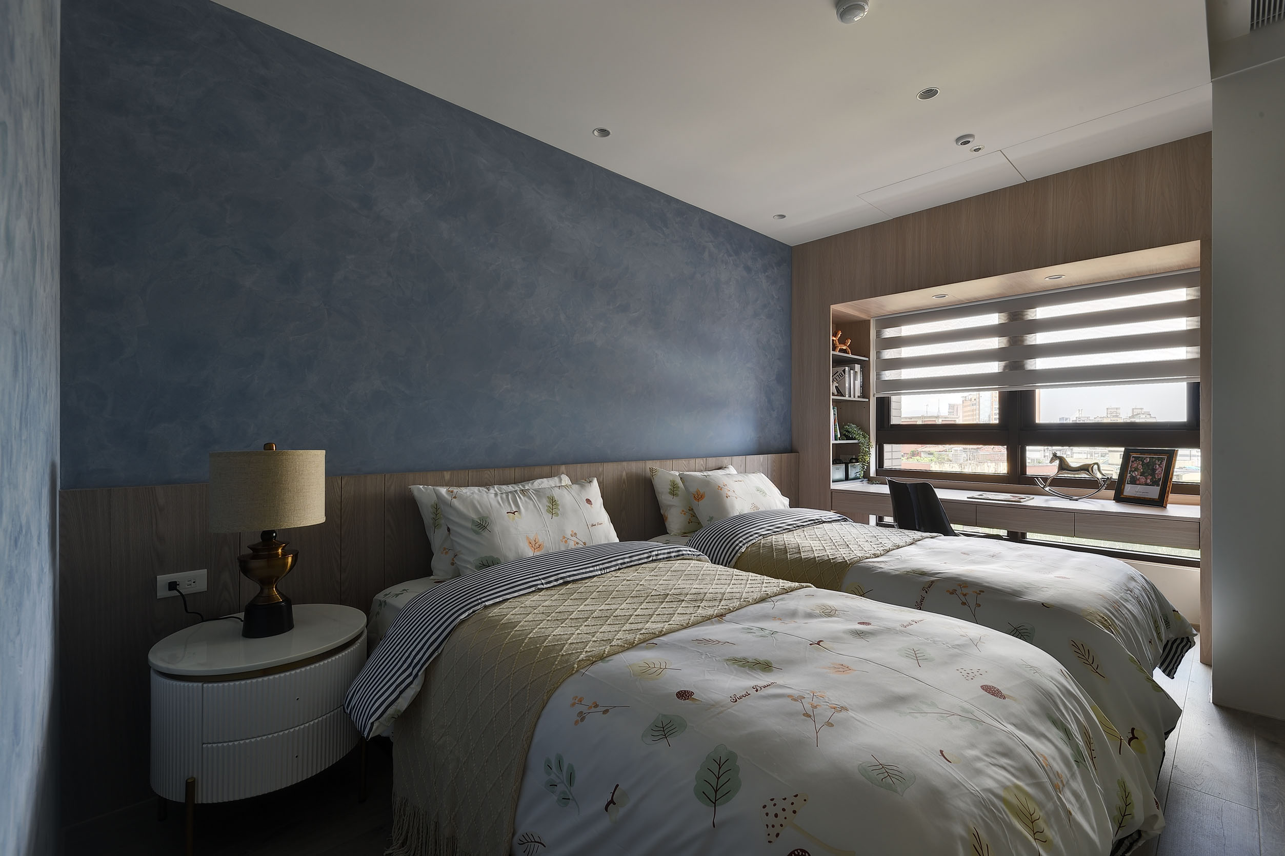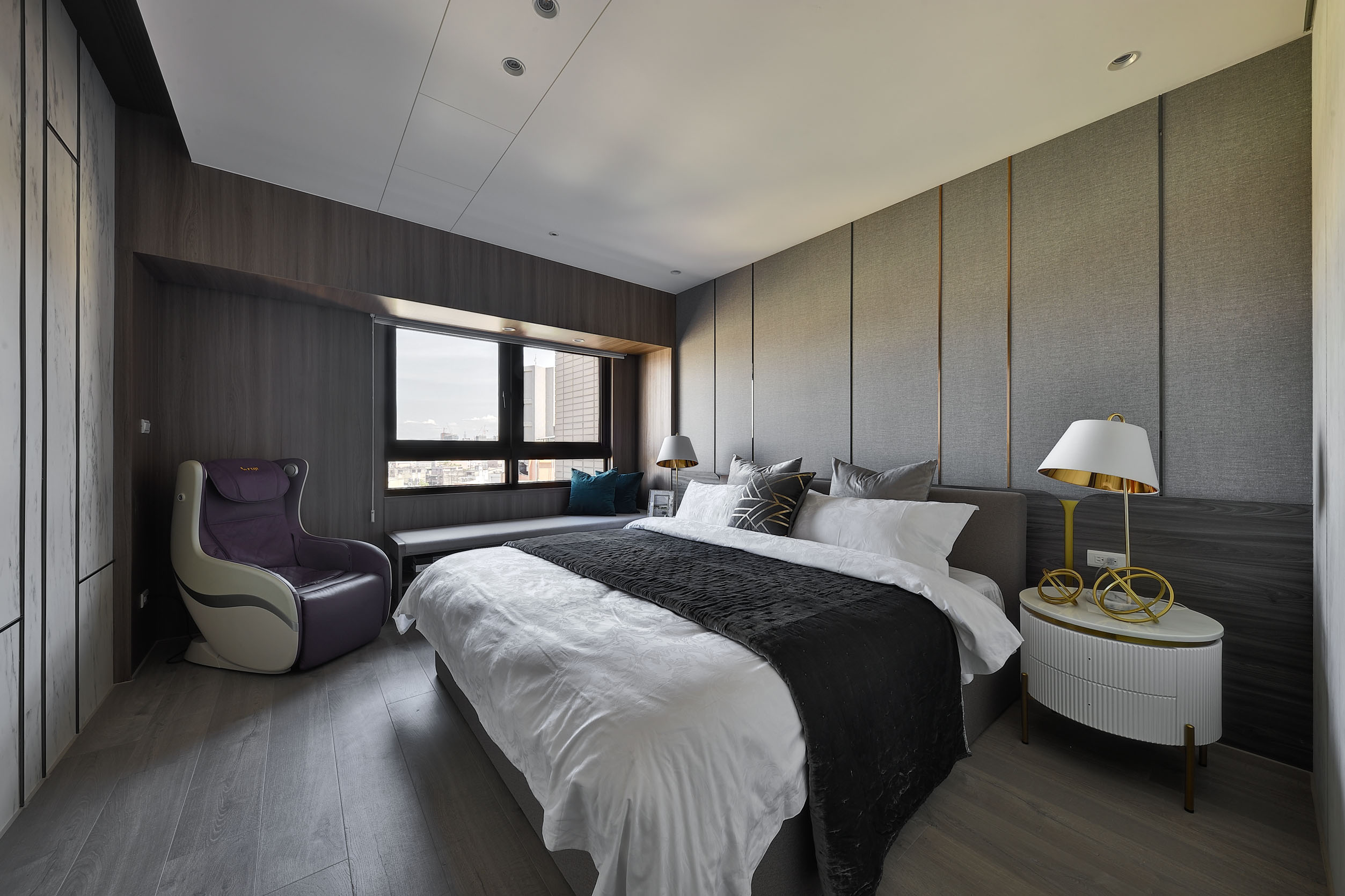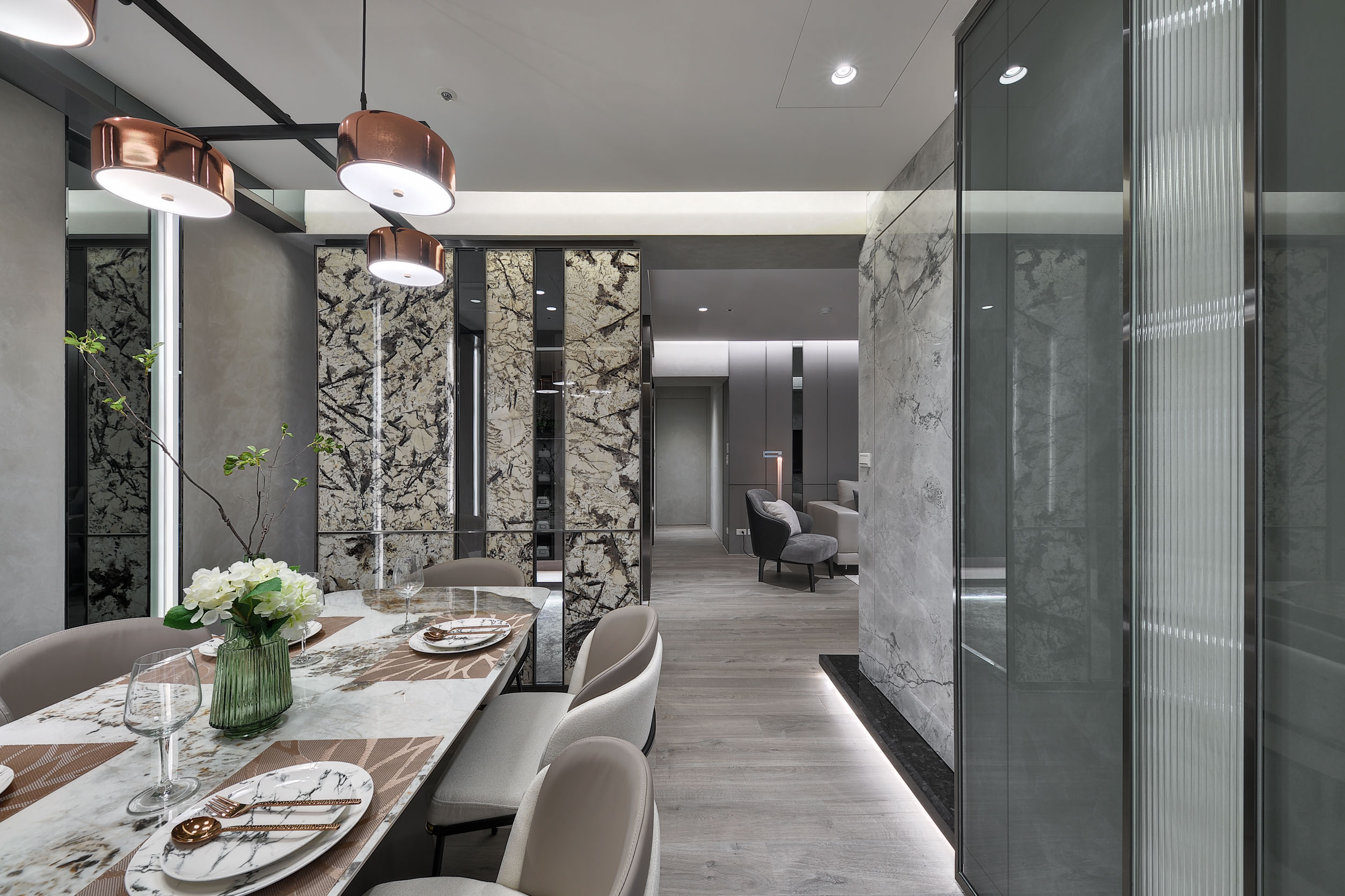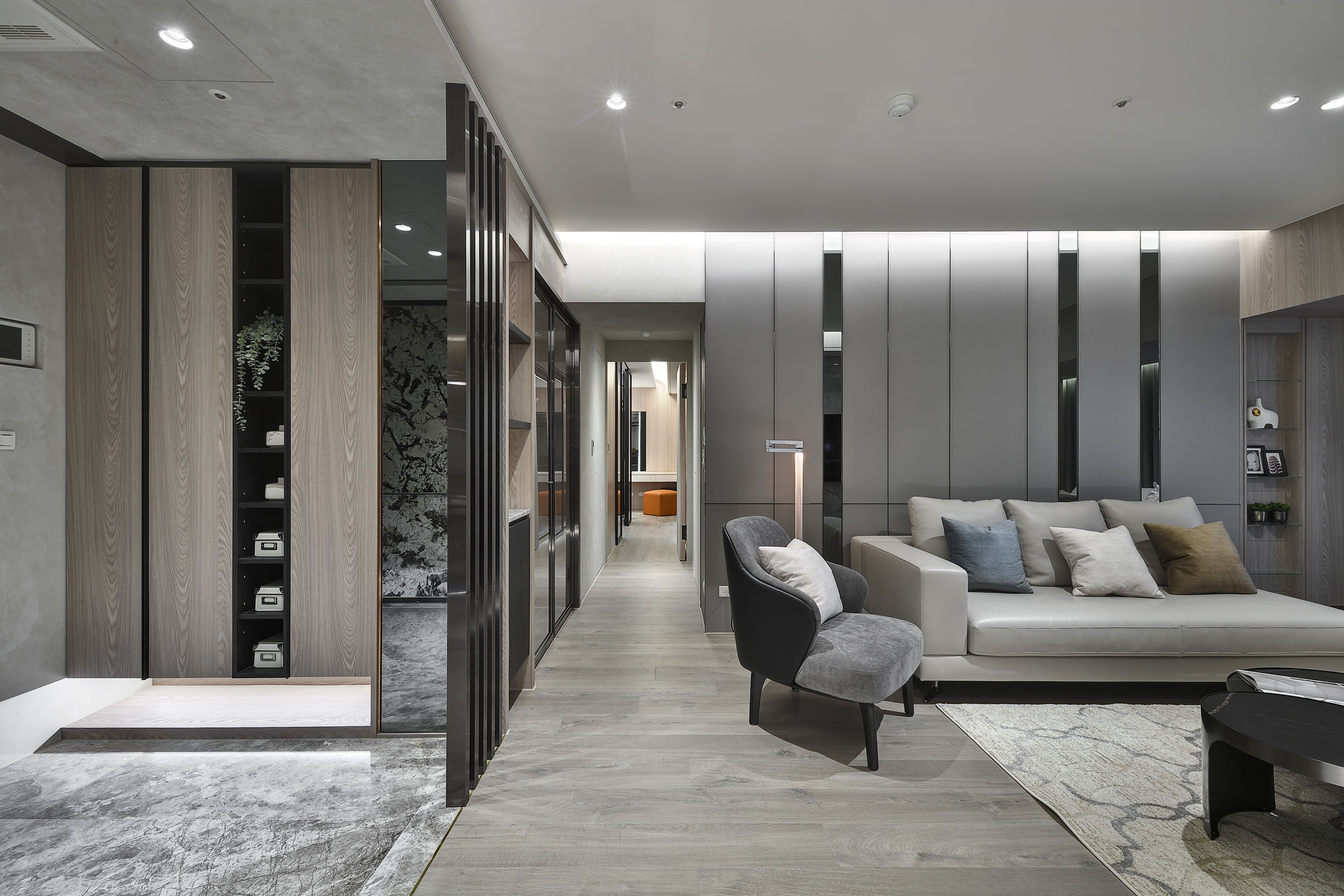 本案為設計師為一家四口量身訂製大人小孩的優質居所。從入口處以大理石地板,讓玄關與室內空間完美劃分,搭配大理石隔屏讓用餐區域獲得適當隱私。天花與地板處貼心設置著間接照明,使光線均勻打亮空間、營造氣氛。部分收納櫃門板與衣帽間採用半透明玻璃,兼具朦朧的美感與隱蔽性。主臥室色調承襲公共空間和諧的灰色,而小孩房則以爽朗的藍色混和白色妝點牆面,可見設計師在用色上細膩的考量。