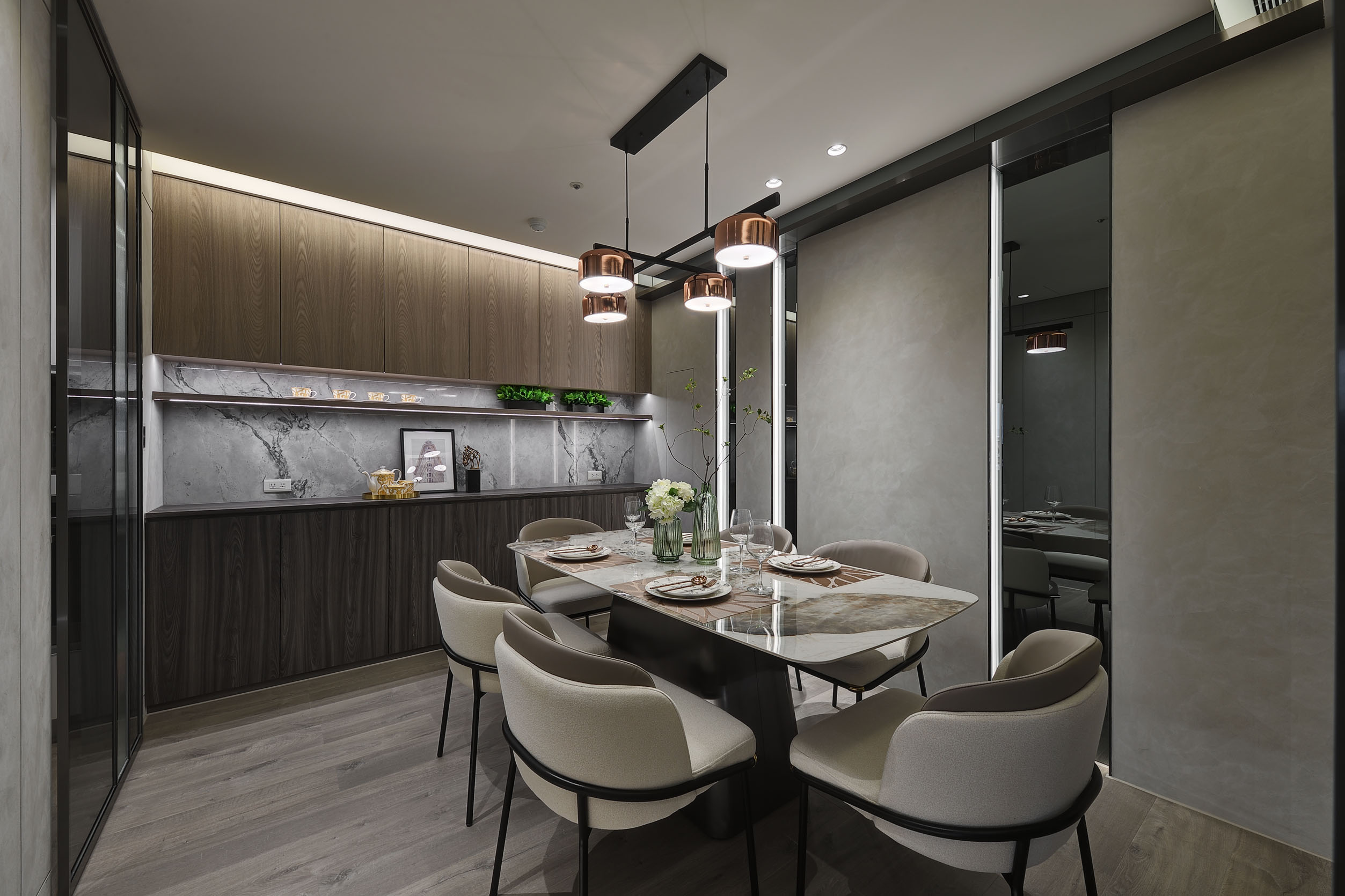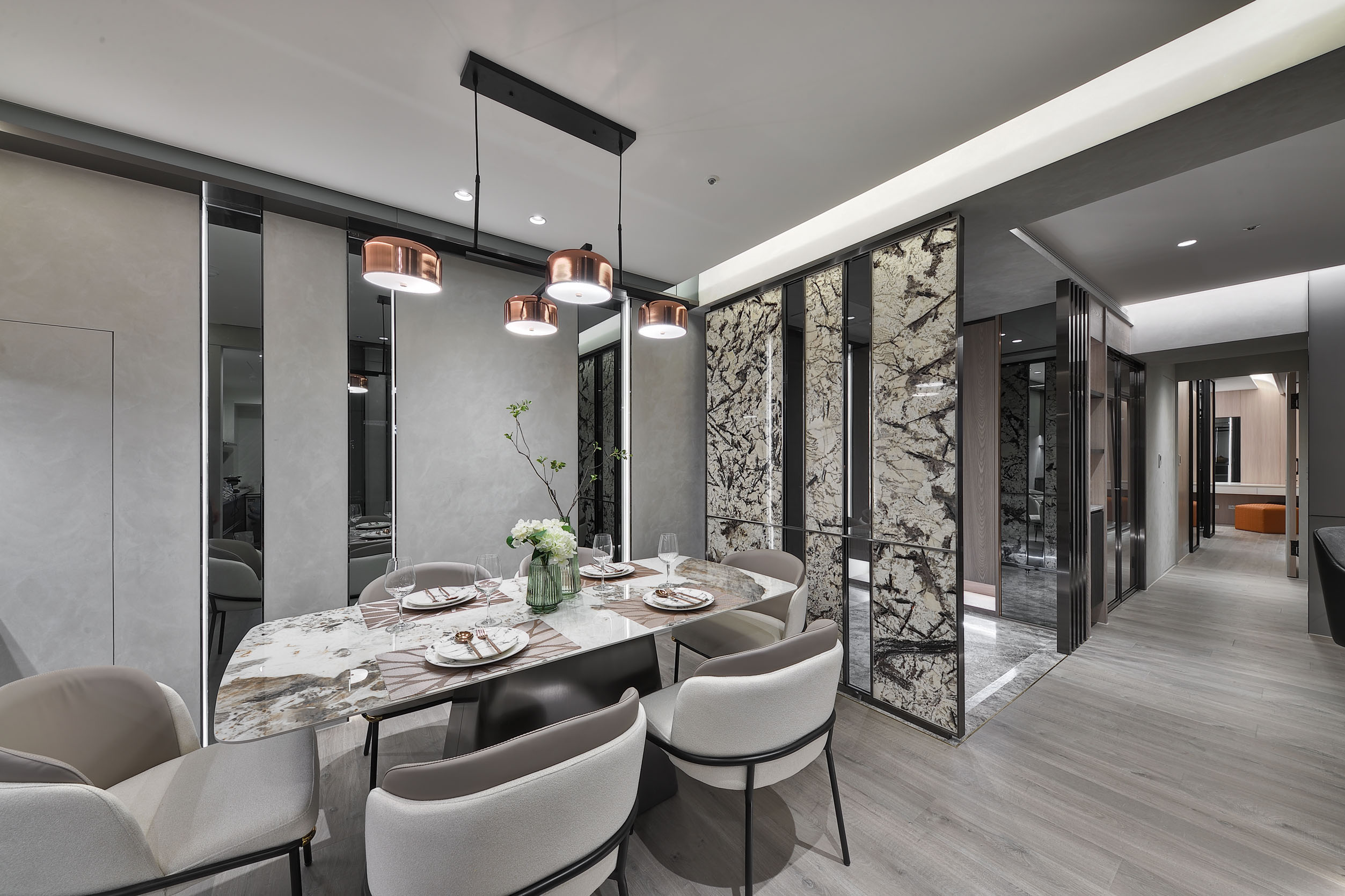 This is an interior case designed for a family of four members. The entrance is elaborated with marble flooring, which fully divides indoor space and pairing with a marble partition allows proper privacy in the dining area. The ceiling and floor are set up with indirect lighting, so that the light can evenly distribute the space and create atmosphere. Some cabinet door panels and wardrobe are made of translucent glass, which gives a hazy look and enough concealment. Furthermore, the harmonious gray color of the master bedroom is the same as the public space, while the children’s room is decorated with bright blue and white on the wall, which shows the designer’s sensitivity in the use of colors.