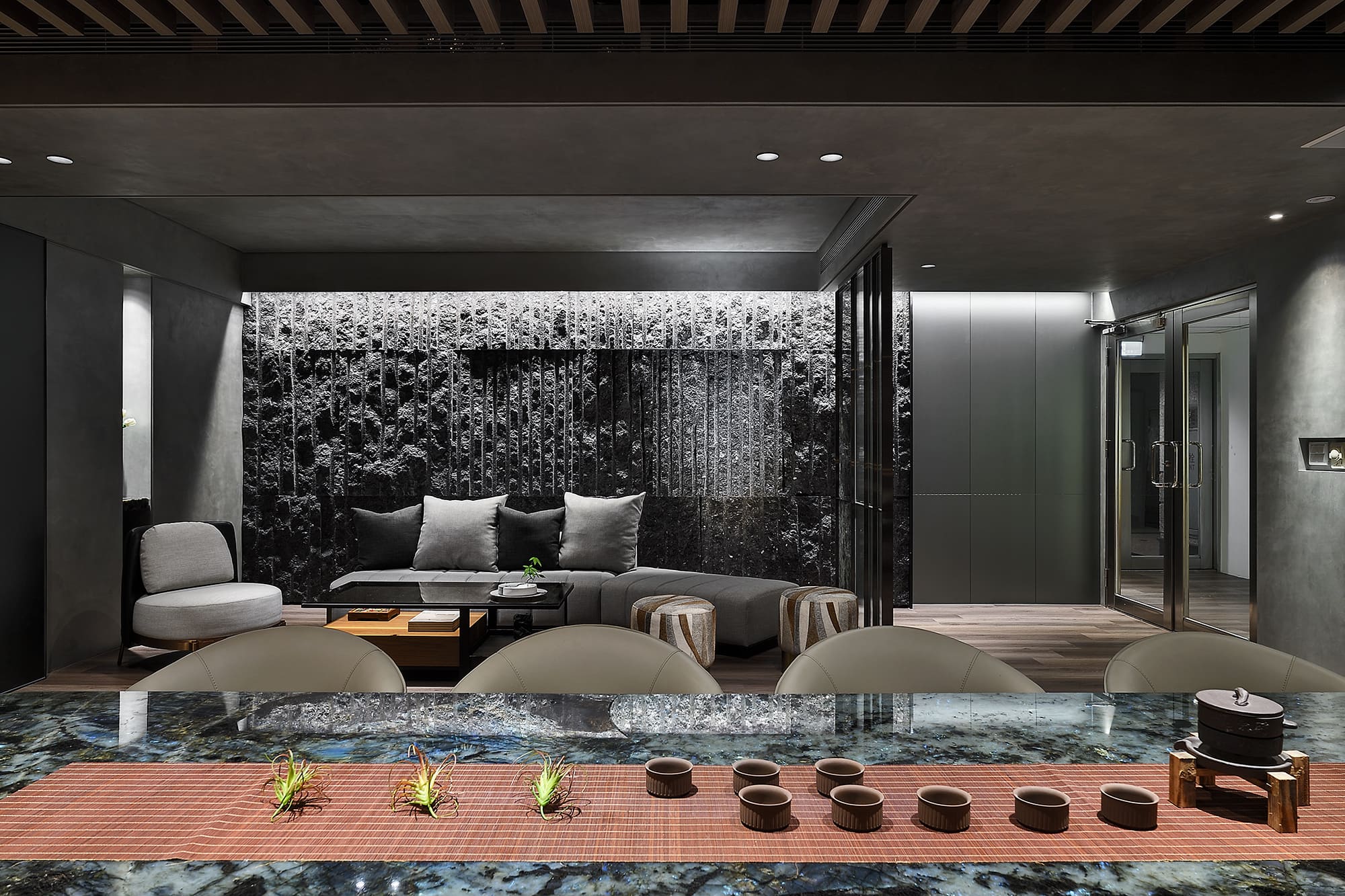 期望讓生活更貼近自然環境,平時深入山林的夫妻,選擇將碧潭山水融於日常生活,在家的每一日都值得品味珍藏。有別於普遍的都市住宅安排,利用設計手法模糊空間界線,將山景引入室內,讓室內外融合為一。開放寬敞的空間、光線照耀於每吋方田,讓生活互動、光影交織,成為室內空間最恰好完美的景緻。